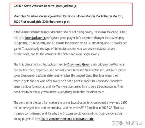 如果勇士拿到小贾伦-杰克逊,无论现阶段即战力,还是以后发展来看,都算一笔值得期待的投资。要知道小贾伦-杰克逊作为2018届球员,现在也只有26岁而已,即将进入职业生涯巅峰期。所以如果不出现重大伤病,小贾伦-杰克逊既可以提供稳定即战力,而且哪怕未来功勋元老退役,由于他能胜任内线两个位置,干脆可以直接弥补追梦格林空缺了。